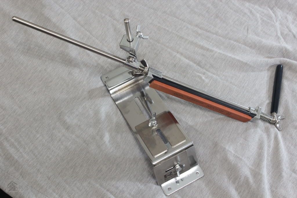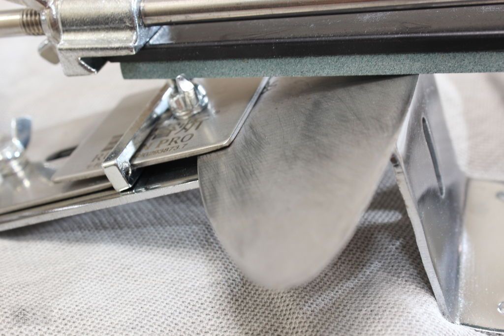 扣上磨刀石,便完成組裝。磨刀石座也是金屬製品,靠近手把這邊有個彈簧,鬆開或固定都靠它。一般磨刀是刀動石不動,這款則為石動刀不動,以物理學來說,兩者能產生摩擦就好,皆能產生打磨拋光效果。