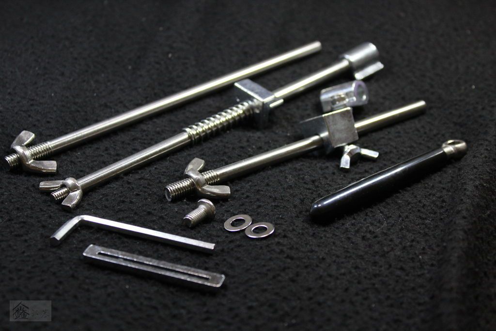 這是磨刀過程的主要活動組件,姑且將整個組成稱為磨刀棒,把長短兩根棒連接鎖好,再上緊蝴蝶螺絲。