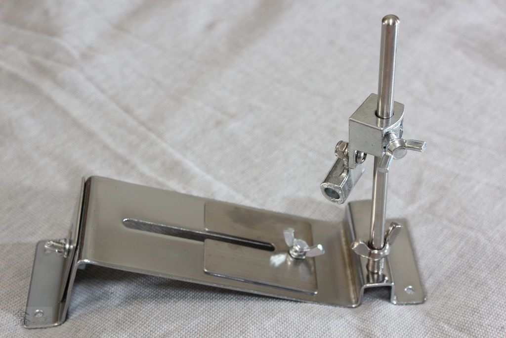 這是垂直金屬柱,主要用途是設定磨刀角度,以及提供磨刀棒一個半固定活動軸。活動軸雖是可動式,但限制了磨刀的可移動範圍。
